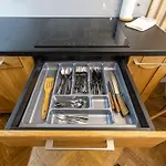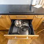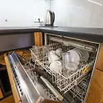 Köket innehåller mikrovågsugn, diskmaskin och tvättmaskin.